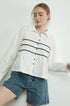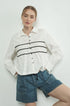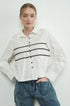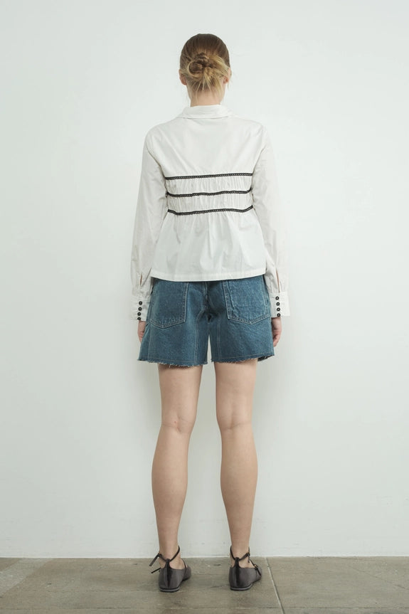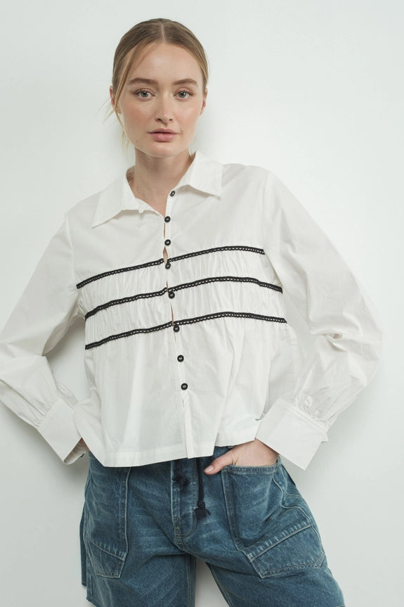 This babydoll shirts is featured in a classic cotton fabrication and slightly cropped fit with gathered detail and contrast lace trim. Boxy fit, Cotton fabrication, collared-neckline, button-front closures, contrast lace trim, gathered detail for added dimension, long-sleeves with cuffs.