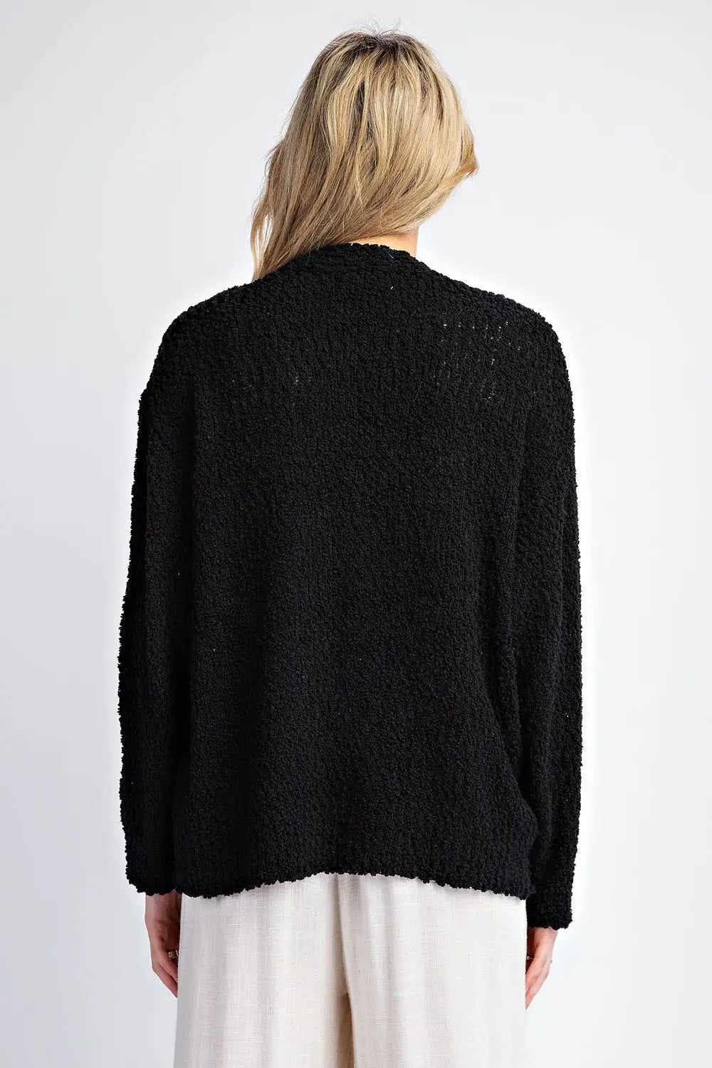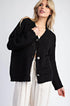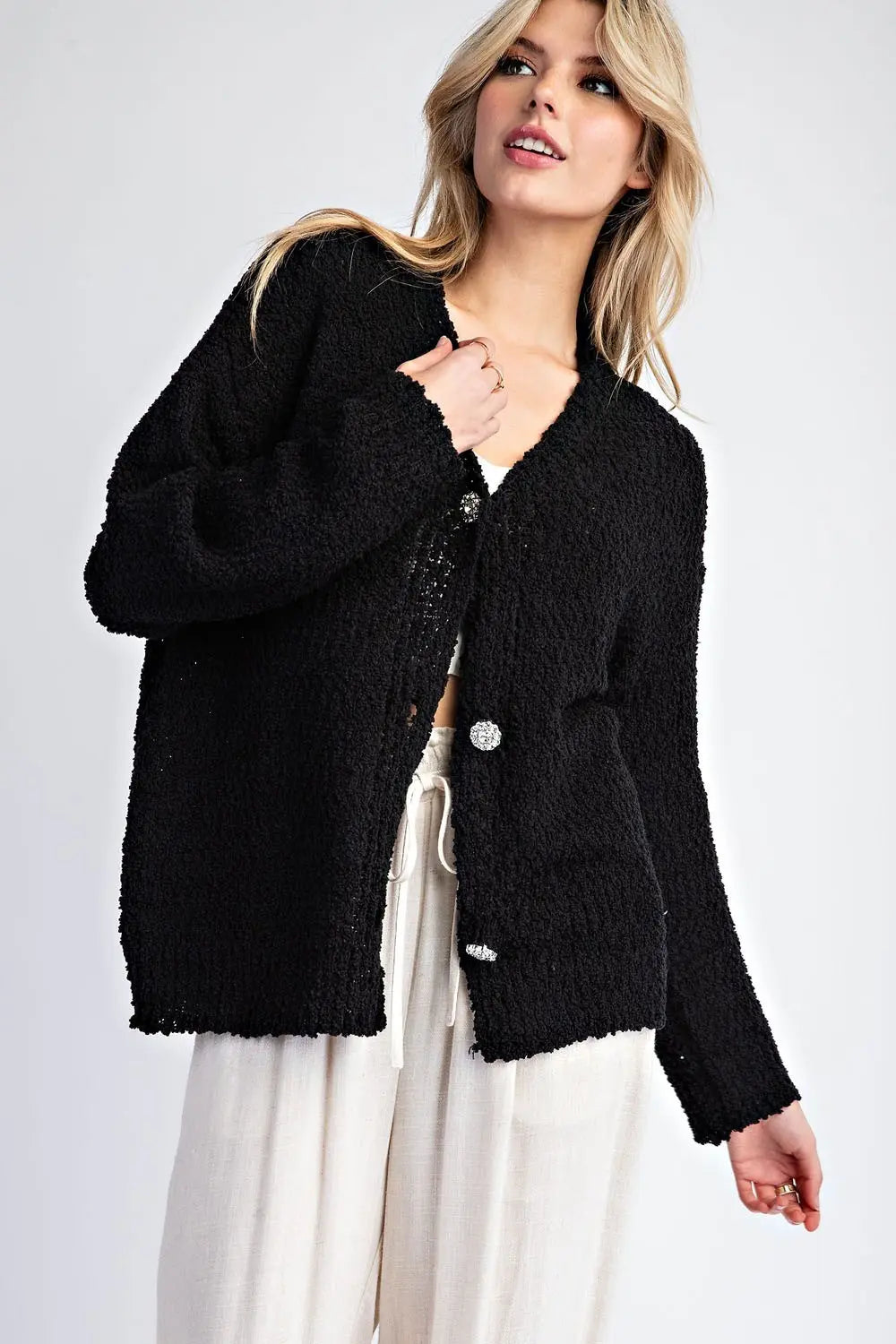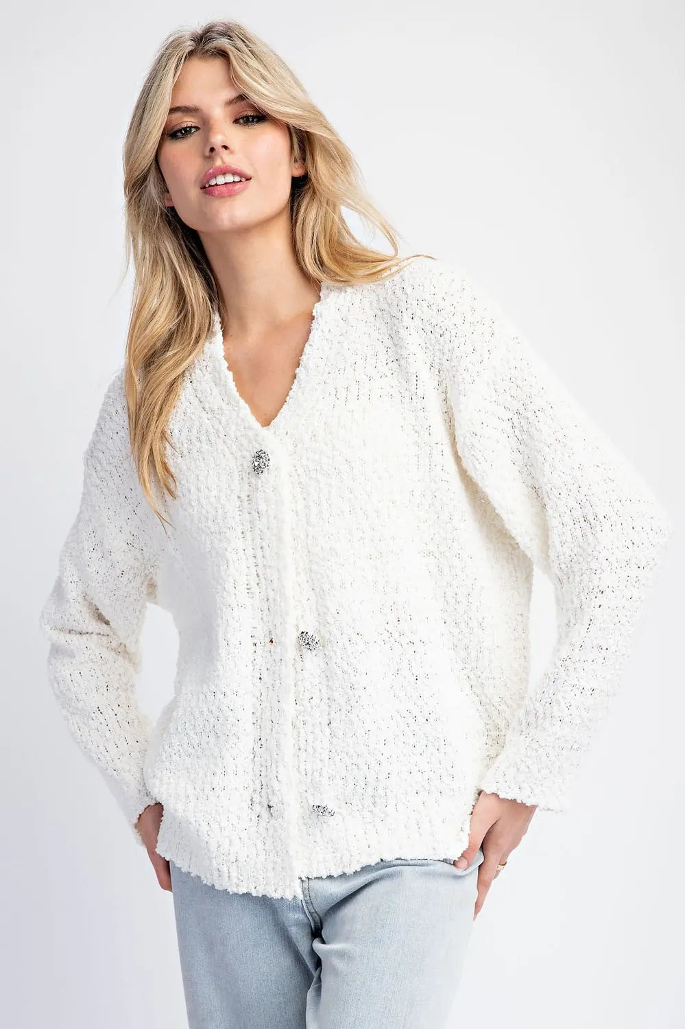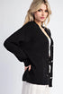 Long sleeve sweater cardigan featuring a button down front, sparkle buttons and is soft but relaxed material. Model is 5'8" and wearing a small.