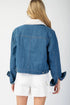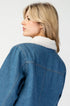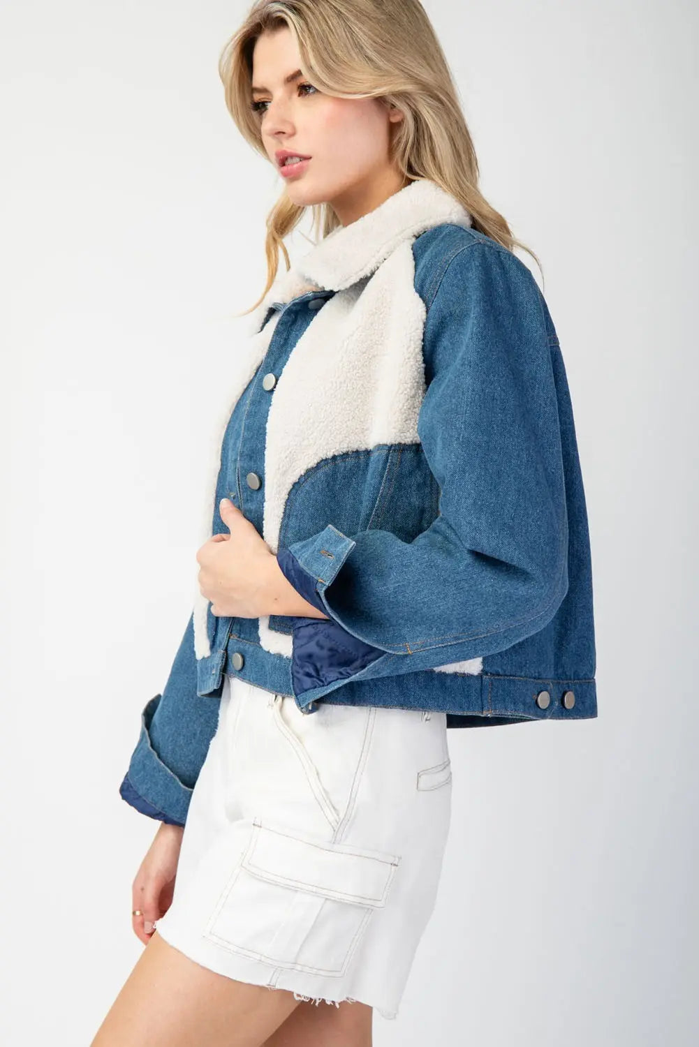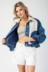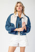 Snow washed long sleeve button down jacket featuring a fur collared neckline, color block fur detailing on the front, two side hip pockets, buttoned cuffs, button cinching on the sides, quilted lining and is a slight cropped length.