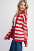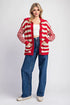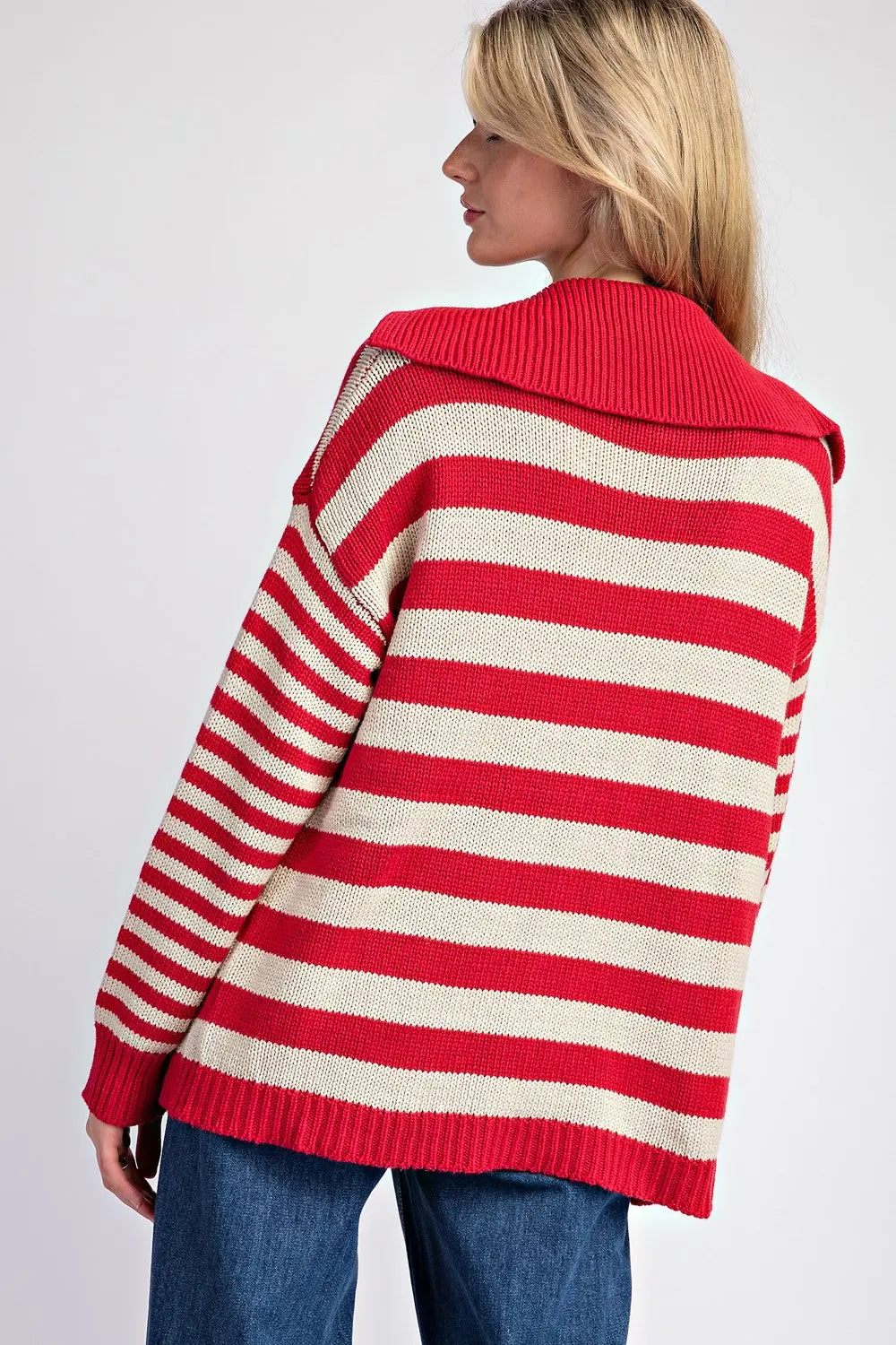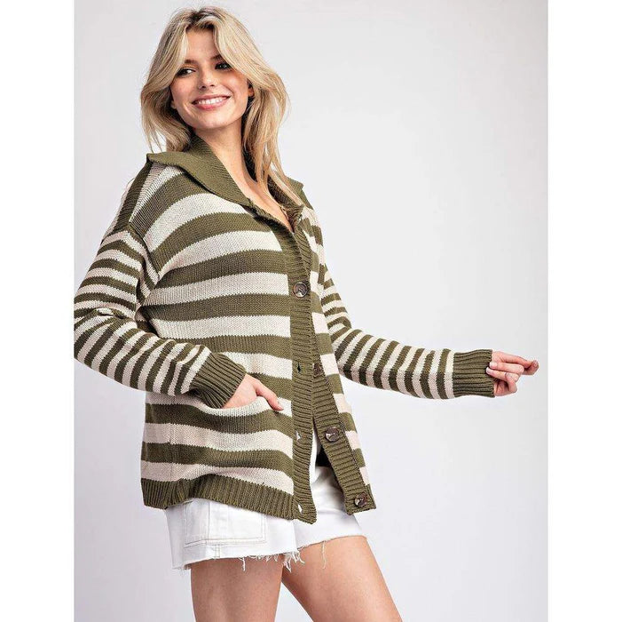 Striped long sleeve sweater cardigan featuring a button down front, a ribbed sailor collar, two open front pockets, a ribbed bottom band and ribbed cuffs. Model is 5'8" and wearing a small.
