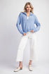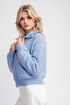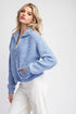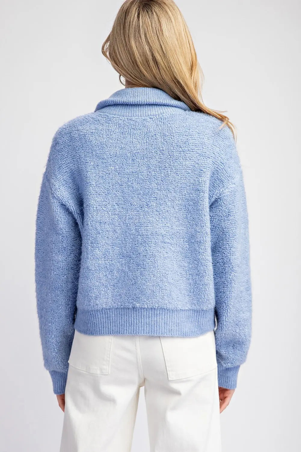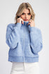 Long sleeve knit sweater jacket featuring a zipper front, a collared neckline that can turn into a mock neck, two side hip pockets with rib detailing, a ribbed bottom band and ribbed cuffs.