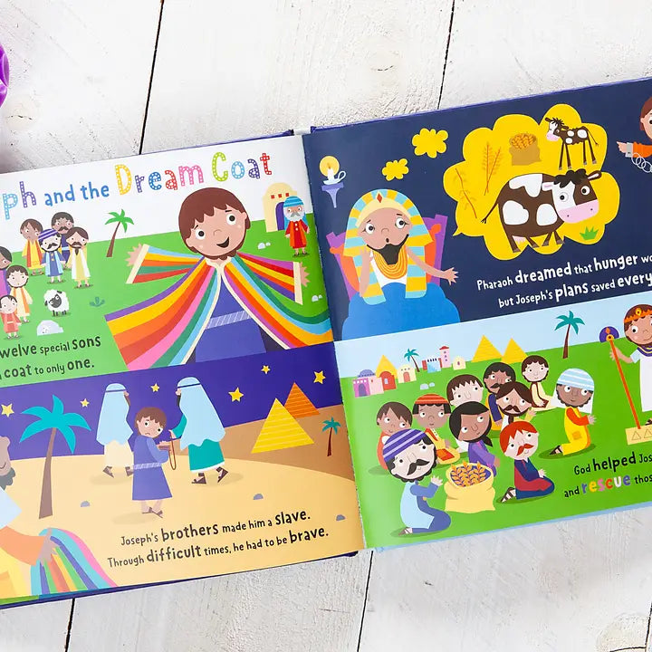 Explore the captivating glitter-globe cover, filled with liquid and shiny confetti. Then join Jesus, Noah, Jonah, Daniel, and other key figures on their exciting and important adventures!