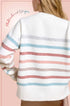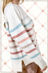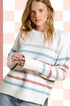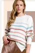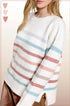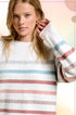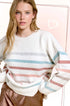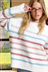 Wrap yourself in comfort with this soft, cozy sweater featuring multi contrast colored stripes for a playful yet polished look. Designed with a ribbed round neck and cuffs, this warm knit sweater offers a relaxed fit with a stylish high-low hem and subtle side slit for added movement and modern appeal. Perfect for layering through the seasons, this striped staple brings effortless charm to any casual outfit.