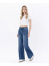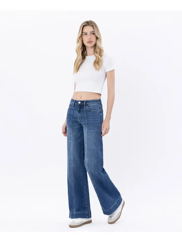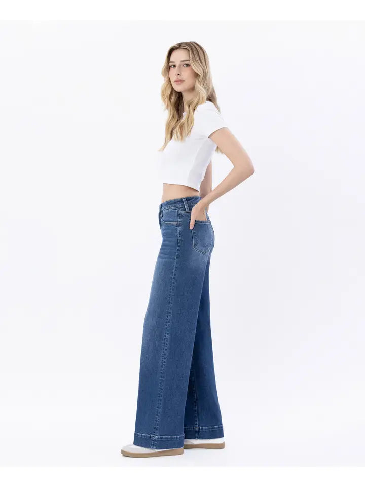 High rise trouser hem wide leg jeans Comfort stretch denim, high rise waist, trouser hem, full length, wide leg jeans F. Rise: 10" / inseam: 33" / leg opening: 23" Model is 5'10" wearing a size 26