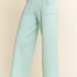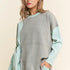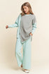 Women's 2PC soft knit set. Top: Long sleeve color block pointed bottom hem with a ruching side detail. Bottoms: Soft knit solid color bottoms. Wide leg. Designed with pockets and drawstring.