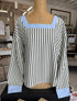 A fresh take on classic stripes! This lightweight top features a modern square neckline, contrasting blue trim and cuffs, and a relaxed, easy fit. Perfect for pairing with denim or trousers for a chic, put-together look.